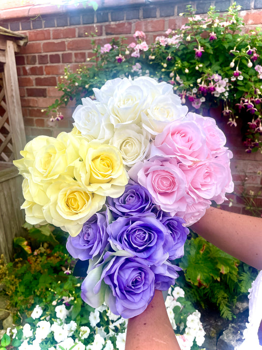 Custom Faux Rose Bridesmaid & Flower Girl Bouquets with Personalised Ribbon, Wedding Keepsake Flowers