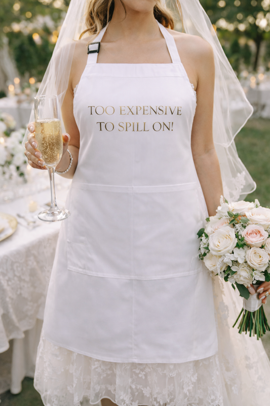 Too Expensive to Spill On Wedding Apron, White or Black with Gold Metallic Text, Bridal Dress Protection Apron